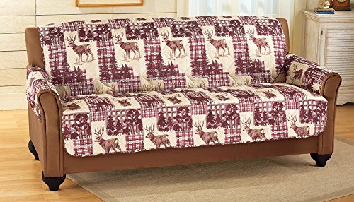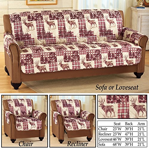 -. Feature : Protect your furniture from wear and tear, pet hair and more with these attractive, quilted furniture covers. / The woodland-style covers have a patchwork-style design featuring forest scenes and deer with burgundy, tan and cream plaid patches. / Polyester and olefin; imported. / Machine washable. / Sizes available to fit a Chair, Recliner, Loveseat, or a Sofa.