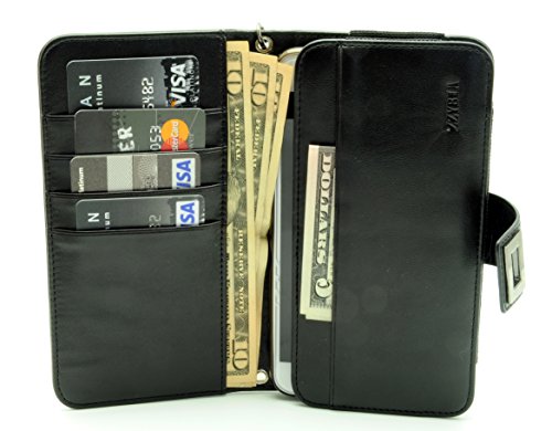 Great size and good amount of compartments. 4 Credit card slots, 2 sections for money and receipts, can put bills in it and 1 zippered pocket behind the wallet. Have a removeable chain strap so you can use it as a crossbody purse. Have a removeable wrist strap too. Can hold your Smartphone wallet case in fashionable.