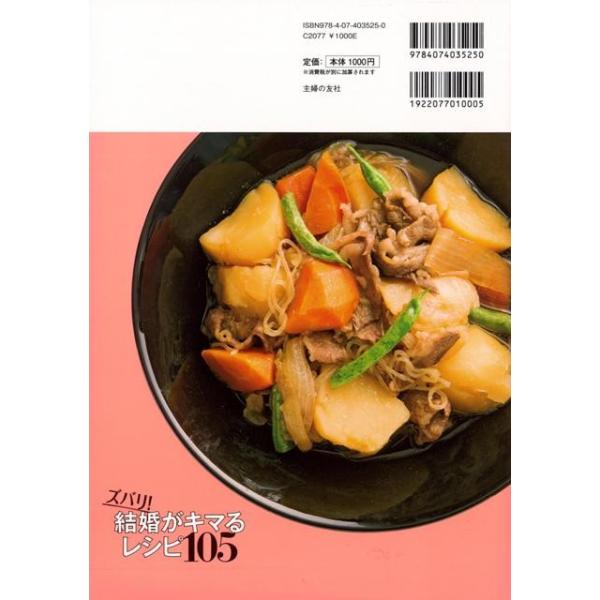 【商品基本情報】 商品名称:ズバリ!結婚がキマるレシピ105 著者/出版社:主婦の友社 編/主婦の友社 編 初版発行日:2015/11/30 サイズ:B5判 ページ数:96 ISBN/JAN:9784074035250/4528189502321