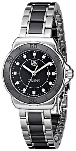 Stainless steel watch featuring round black dial with diamond hour markers, unidirectional bezel, and black ceramic center bracelet links