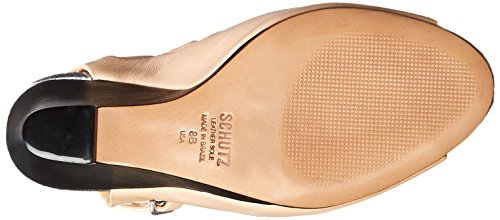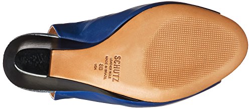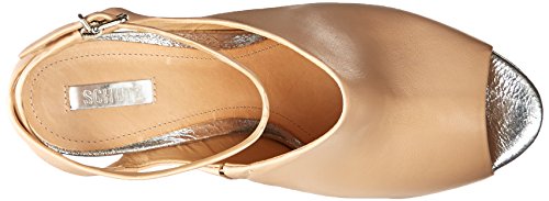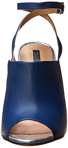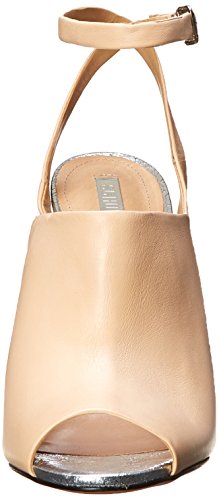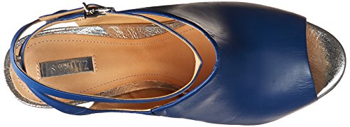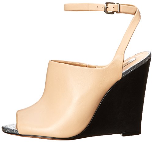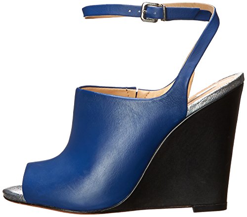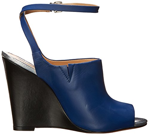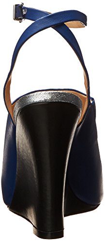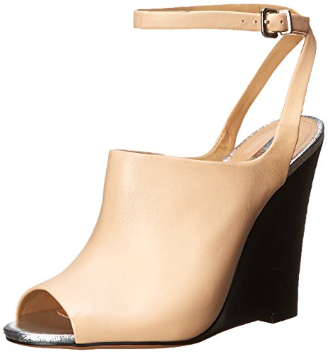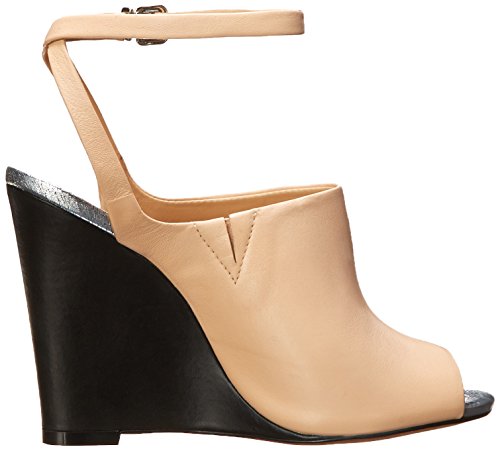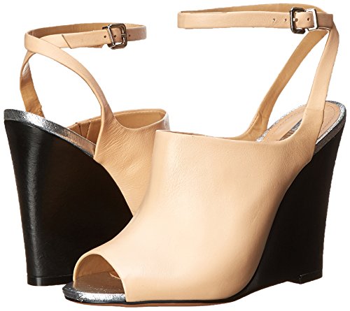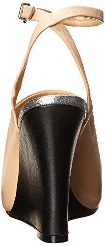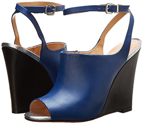Mule-inspired sandal featuring contrasting wedge, metallic inset at toe, and adjustable ankle strap with buckle