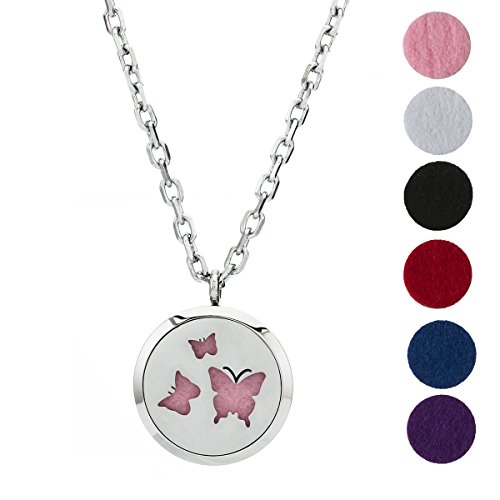 Premium Aromatherapy Essential Oil Diffuser Necklace Butterfly Locket Pendant, Hypo-allergenic 316L Surgical Grade Stainless Steel Jewelry with 24" Chain and 6 Washable Pads