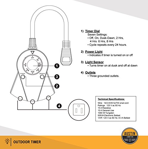Outdoor Outlet Timer with Photocell Light Sensor, Weatherproof – Austin Light Co. - Black - UL Listed. Indoor and Outdoor. Commercial Grade. Great for Christmas, holiday lights, patio, backyard, home