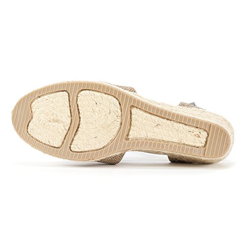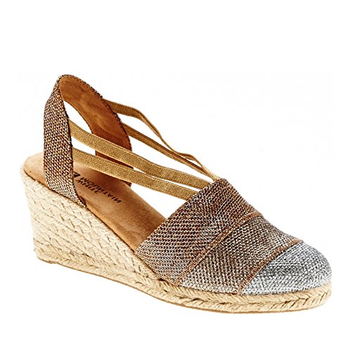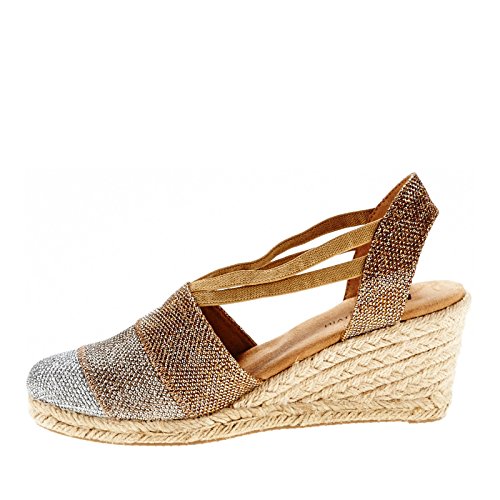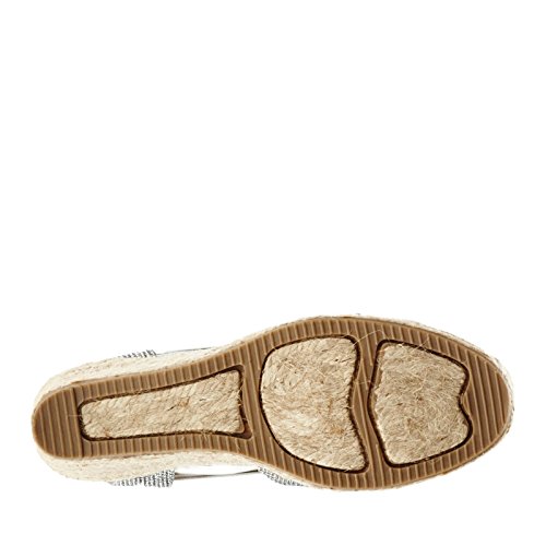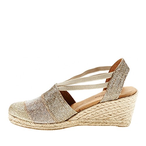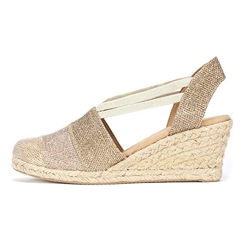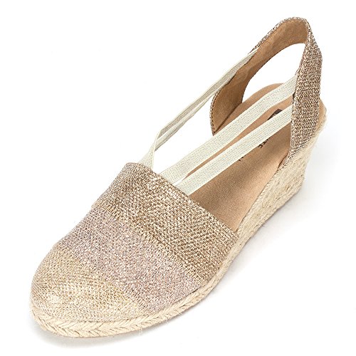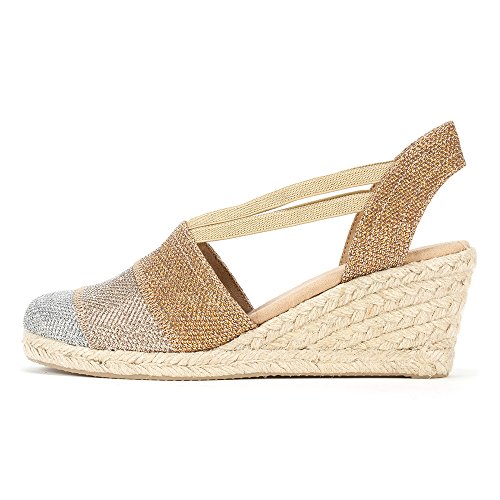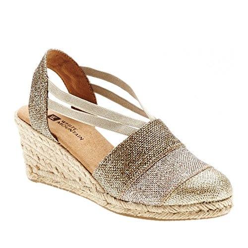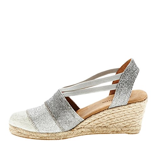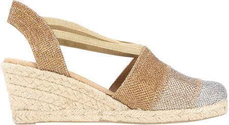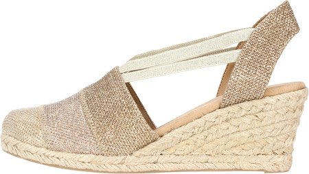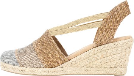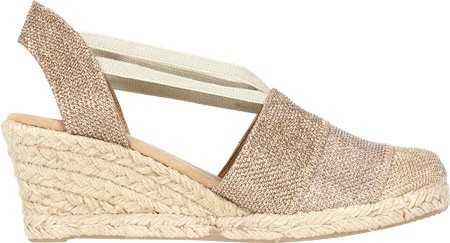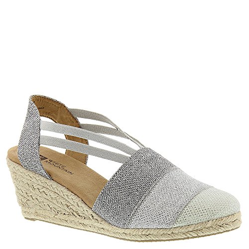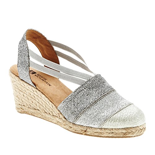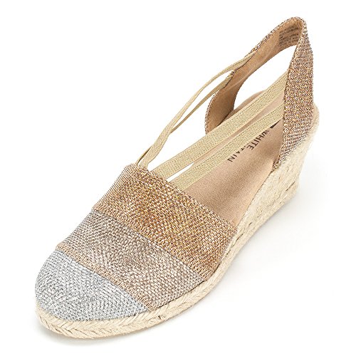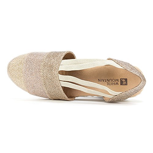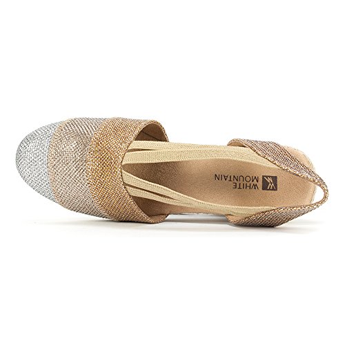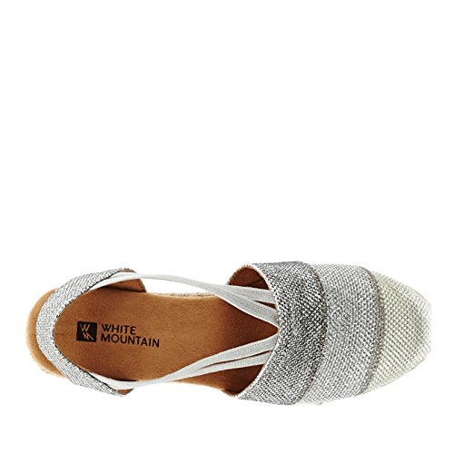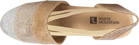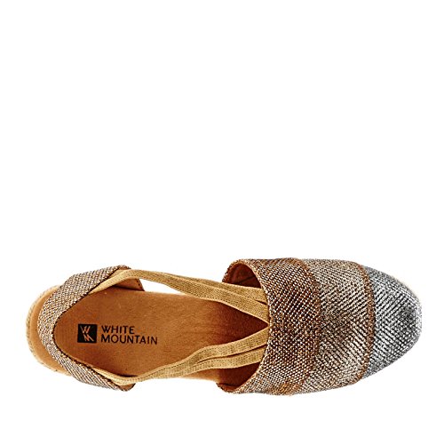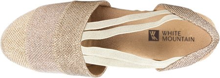 Studio : White Mountain Publisher : White Mountain Binding : Apparel Product Description All that glitters... White Mountain Supreme Espadrille Sandals atop foot-conforming, supportive footbeds This closed-toe espadrille is a winner with a suede sockliner to absorb moisture. The supportive memory foam footbed cushions feet, while the metallic fabric upper allows them to breathe. Plus, it has elastic straps allow a foot-hugging fit, a partially open back for an airy look and a rounded toe box for wiggle room. Jute trim adds visual interest to the durable thermoplastic rubber outsole and wedge. 0