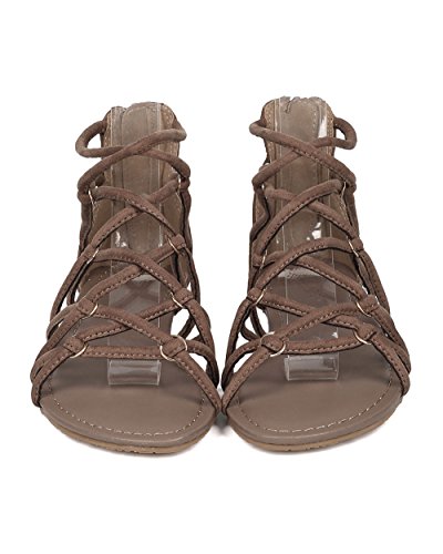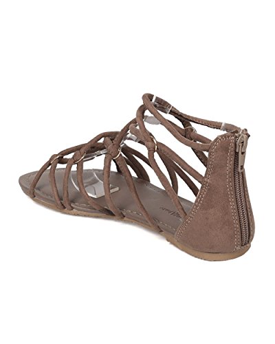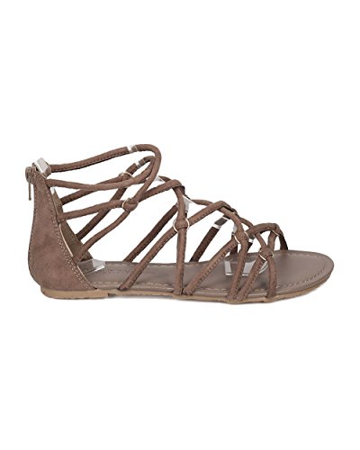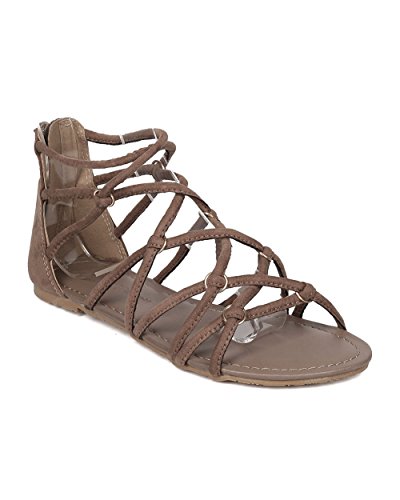 Product Description These gladiator sandals are made with a faux suede upper, open toe and strappy construction. Also made with metallic hardware, flat heel and hind zip for easy slip on and off. 0