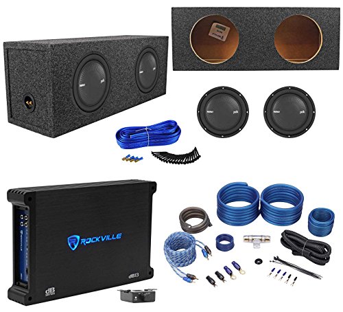 -. Feature : Package Includes: (2) Polk Audio MM1042SVC 10" Single 4-Ohm Car or Marine Subwoofers Totaling 2400 Watt + Rockville dB13 3000 Watt Peak 1500 Watt RMS Mono Class D Car Amplifier + Rockville RWK41 4 Gauge 2 Channel Complete Wire Kit With RCA Cables + Rockville RD10 Dual 10" 1.0 cu. ft. Sealed Subwoofer Enclosure + Dual Enclosure Wire Kit With 14 Gauge Speaker Wire + Screws + Spade Terminals / Polk Audio MM1042SVC 10" 1200 Watt Single 4-Ohm Car/Marine Audio Subwoofer Sub. Driver Compliment: 10" (254mm). Cutout Dimensions: 9" (230mm). Mounting Height: 0.55" (14.06mm). Mounting Depth (Top): 4.6" (115mm). Mounting Depth (Bottom): 5" (129mm). Peak Power Handling: 1200 Watts. Continuous Power Handling: 400 Watts. Nominal Impedance: 4 Ohms. Frequency Response: 28Hz-200kHz. Sensitivity: 86 dB. Magnet Weight: 54.4 oz. / Rockville dB13 3000 Watt/1500w RMS Mono Class D 2 Ohm Amplifier. CEA Compliant Power Ratings . 2 Ohm: 750 Watts x 1 Channel <1% THD+N. 4 Ohm: 450 Watts x 1 Channel <1% THD+N. RMS Power Ratings: . 2 Ohm: 1500 Watts x 1 Channel. 4 Ohm: 900 Watts x 1 Channel. Peak:. 2 Ohm: 3000 Watts x 1 Channel. 4 Ohm: 1800 Watts x 1 Channel. High-Speed MOSFET Power Supply. Optical Coupler Class "D" Technology. / 1 - 17' High Grade Twisted Pair of 100% Copper RCA Cable. 17' - 4 Gauge Translucent Blue SuperFlex Power Cables. 17' - 18 Gauge Blue Remote Cable. 17' - 16 Gauge Clear Speaker Wire. 3' - 4 Gauge Clear SuperFlex Ground Wire. Gold Plated AGU Heat Resistant Fuse Holder. 60 Amp AGU Gold Plated Fuse. 7' Split Tube Loom. Accessories Included: Wire Ties, Ring Terminals, Butt Connectors, Spades, and Grommets. / Rockville RD10 Dual 10" Sealed Subwoofer Enclosure. Proudly Made In The USA, Using Only The Finest Quality Materials - For The Best Level of Performance From Your Subs!. 3/4" USA Heavy Duty MDF Construction. Machine precision cut mounting holes . Top of the line Glue for extra durable adhesion. High quality GOLD spring loaded terminals. Designed, tested, and engineered to work with most of today's popular woofers.
