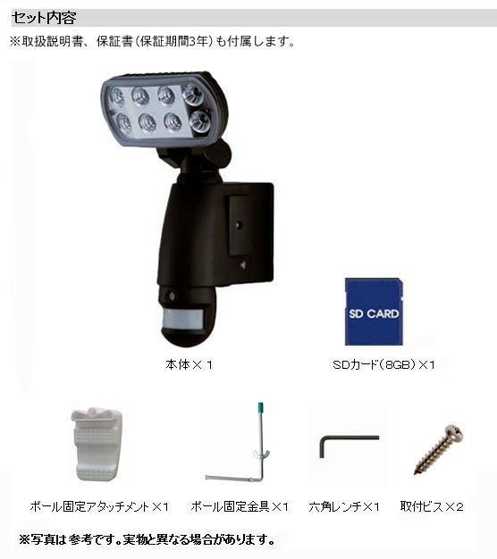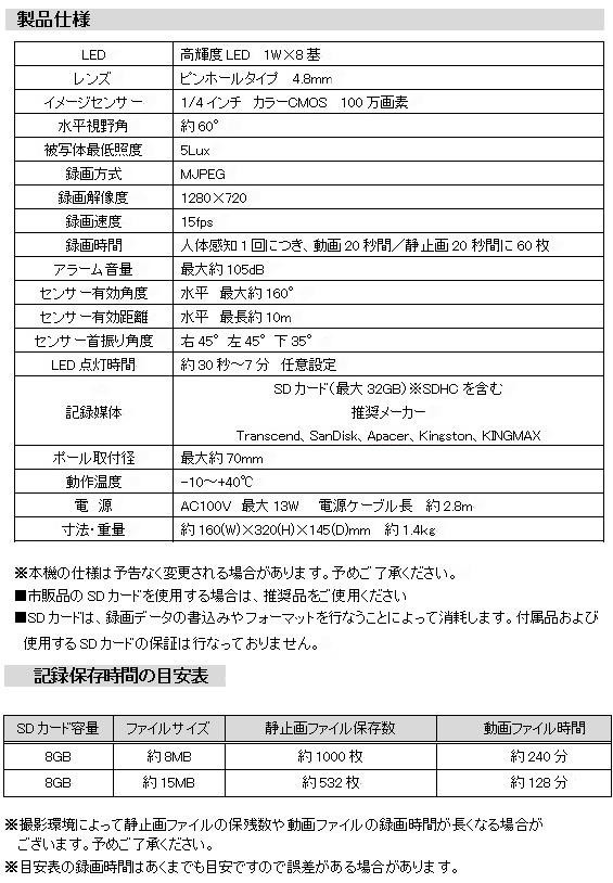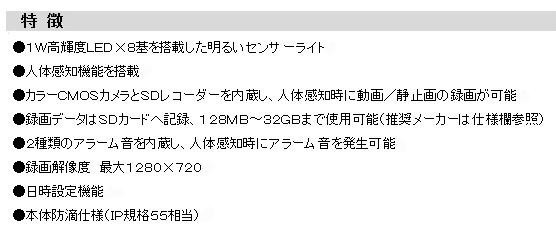 カラーCMOSカメラとSDカードレコーダーを内蔵し、動体を検知した時に、動画/静止画の録画が可能。録画データはSDカードへ記録。2種類のアラーム音を内蔵し、人体感知時にアラーム音を発生可能。本体防滴仕様(IP規格55相当)。 |