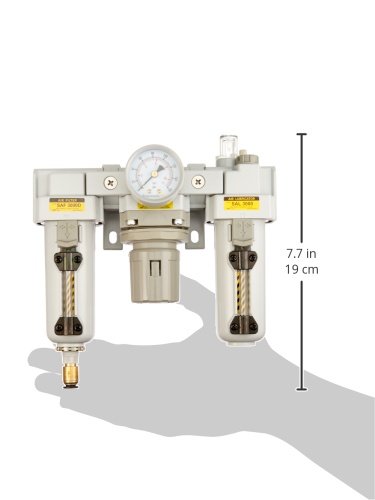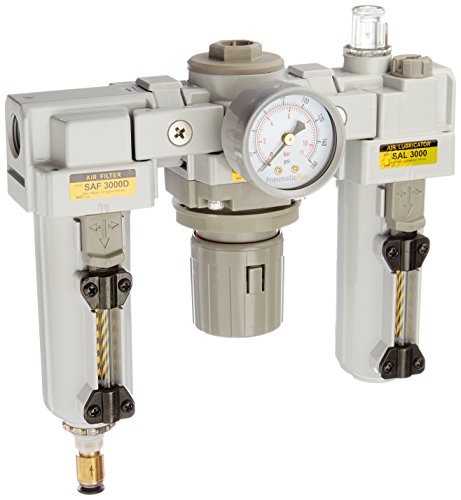 PneumaticPlus SAU3000M-N03DG-MEP 3 Unit Combo Compressed Air Filter Regulator Lubricator, 3/8" Pipe Size, NPT-Auto Drain, Metal Bowl, 10 μm with Gauge