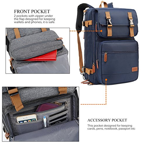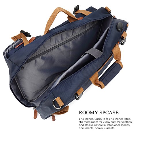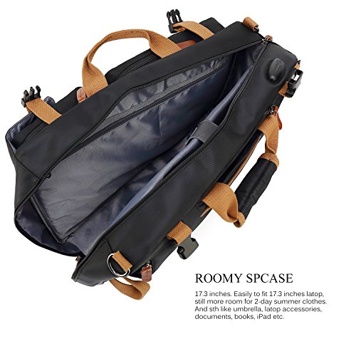 -. Feature : Dimensions: 18.8 x 5.7 x 13.7 inches; Fits up to 17.3 inches laptop. Still more room for 2-day summer clothes. / Three carrying styles. You could use it as backpack shoulder bag and messenger bag. Also the straps can be hidden when you use it a messenger bag and shoulder bag. The handle could be hidden in a pocket with zipper when use it as backpack / Two outside front pockets, front up pocket with flap and buckles to improve safe for wallet, phone, and passport etc.Big front down pocket for keep laptop accesseries etc. / Roomy laptop compartment.Special design laptop compartment with Telescopic belt provides more protection for your laptop. Still keep 2 days clothes for traveling. Roomy enough for your need. / USB 2.0 Charging port design. Built-in USB cable. Use it to connect the power bank, then connect your phone with original USB cable to the USB port, you could charge your phone conveniently.