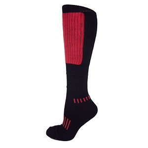 The Deadlift BLOCK!!! These impressive Black Knee-Highs come fully equipped with protection in mind. Featuring heavy cushion in the pattern area, these specialty performance deadlift socks help you come equipped for your best workouts. Protecting the shins and upper leg, these knee-highs will also breath well down below with our original Moxy Performance Foot. Perfect for exercise, fitness, powerlifting, deadlfting, motocross, hardcore sports, skiing, soccer, softball, and lacrosse. Black with Red, Unisex Adult Size.