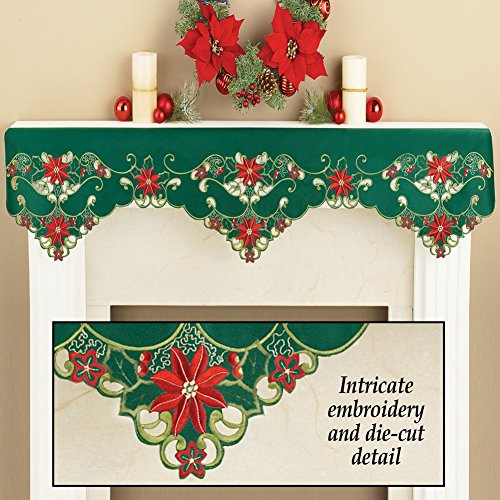 Mantel scarf features embroidered red poinsettias, berries and gold accents.