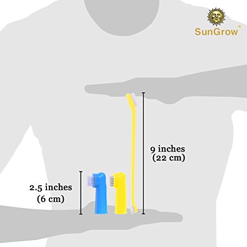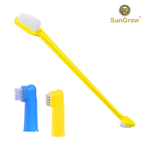-. Binding : Misc. -. Brand : SunGrow -. EAN : 0791043305251 -. Feature : ✔ YOUR POOCH NEEDS YOUR ATTENTION FOR HIS ORAL CARE --- To keep the dental health of your pet in shape, SunGrow dog toothbrush comes with a dual headed brush to suit your different sized pets. It helps in keeping diseases like periodontitis at bay. In this set, you will get two special finger brushes that will help you clean those hard to reach places. / ✔ REMOVE PLAQUE AND FRESHENS DOG'S BREATH --- Brushing your dog's teeth at least once a week is essential for preventing plaque buildup, and it will also help freshen stale doggy breath. Use these brushes for maintaining their oral and dental health consistently. / ✔ ANGLED TOOTHBRUSH FOR EFFECTIVE BRUSHING OF PETS OF ALL SIZES --- The angled brush is very effective for massaging the gum line and cleaning your dog's teeth at just the right angle. This is highly effective in removing any plaque. / ✔ EXTRA SOFT BRISTLED TOOTHBRUSH RECOMMENDED BY VET & GROOMERS --- These extra-soft bristled toothbrush are recommended by veterinarians and pet groomers for cleaning your pet's teeth. They will not cause any bleeding or damage to your dog's teeth or gums. / ✔ ERGONOMIC DESIGN FOR EASY REACH --- The long toothbrush measures 8.6 inches long. This will enable you to reach all the way behind your pets back teeth to make sure they are super clean and healthy. Finger brush measures 2.3 inches for cleaning precise areas. -. Label : MARIMO PET STORE -. Manufacturer : MARIMO PET STORE -. PackageQuantity : 1 -. ProductGroup : Pet Products -. ProductTypeName : PET_SUPPLIES -. Publisher : MARIMO PET STORE -. Studio : MARIMO PET STORE -. Title : 3 Pcs Dog Toothbrush Set -- Dual-headed brush for better dental care - 2 Bonus Finger Brushes included - Removes plaque, freshens dog's breath - Vet & Pet Groomer Recommended - Use with Dog Toothpaste -. UPC : 791043305251