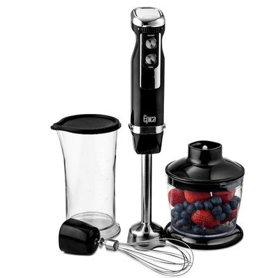 NEVER STRUGGLE WITH FROZEN FRUIT AGAIN: Your old blender''s low-grade blades never stood a chance. The Epica makes a habit of not blending in-this 350-watt workhorse brings you the quickest breakfast smoothies and gourmet soups or sauces at just the right consistency.;DESIGNED FOR SIMPLE, POWERFUL USE: When a hand blender is too complicated to use, it becomes a pain rather than a pleasure. With the Epica easy-control design and quick one-click attachment release, your new hand blender will quickly become the best sous chef you''ve ever had.;MULTI-SPEED FOR MULTI-TASKING CHEFS: From mashed potatoes to strawberry daiquiris, stop leaving chunks behind in your creations. Using the variable speed dial, adjust this blender''s blade speed for the perfect texture every time-thorough grinding, pur?eing, juicing, or chopping.;STAY SHARP WITH EASY CLEAN-UP AND STORAGE: This hand blender''s components are all dishwasher safe. Because after crafting natural baby food or perking parents up with a sweet drink, nobody likes dealing with a mess.;THE 100% EPICA CUTTING EDGE GUARANTEE: We pride ourselves on our superior manufacturing and quality components that go into each of our products. If for any reason your blender doesn''t make your kitchen experience better and easier, send it back for a full refund. Guaranteed.