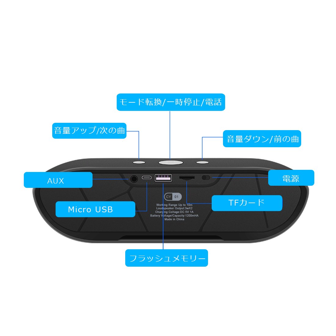 ● 1200 mAH lithium rechargeable battery built-in, transmission distance of about 10 m, handsfree call by built-in microphone is possible.