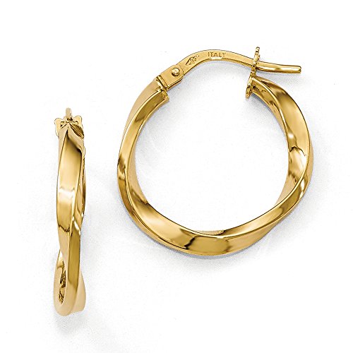 A timeless classic style featuring a twisted round design created from polished 14k yellow gold. These lightweight, hollow hoop earrings are approximately 2mm in width by 20mm (3/4 inch) in diameter. Made in ItalyFeature
