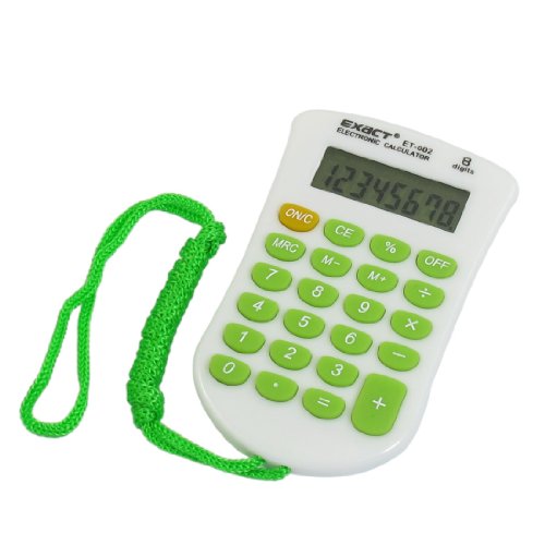 -. Feature : Product Name : Calculator; Display Digits Quantity : 8 Digits / Power Supply : 1 x AG10 Cell Buttery (Not Included);Total Size : 9 x 5.2 x 0.7cm / 3.5" x 2" x 0.27" (LWT ) / Strap Grip : 74cm / 29";Color : Green, White / Main Material : Plastic, Rubber; Weight : 26g / Package Content : 1 x Calculator