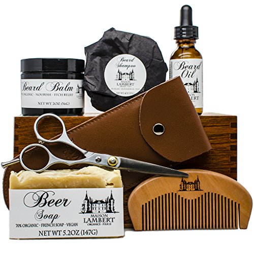 Beard care products included: an organic beard balm, organic beard oil, organic beard shampoo, a scissor, a wood beard comb and a free organic body soap
