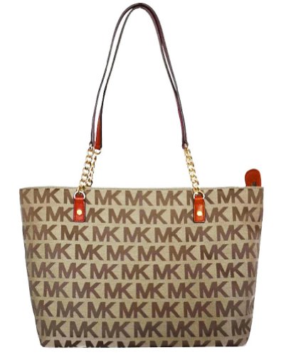 -. Feature : MK Signature Jacquard with Tangerine Leather Trim / 11" Drop Double Leather Straps with Chain / Measures : 12" Buttom / 15" Top (L) x 10" (H) x 5" (D) / Zip Top Closure / signature lining with one zippocket & 4 slip pockets