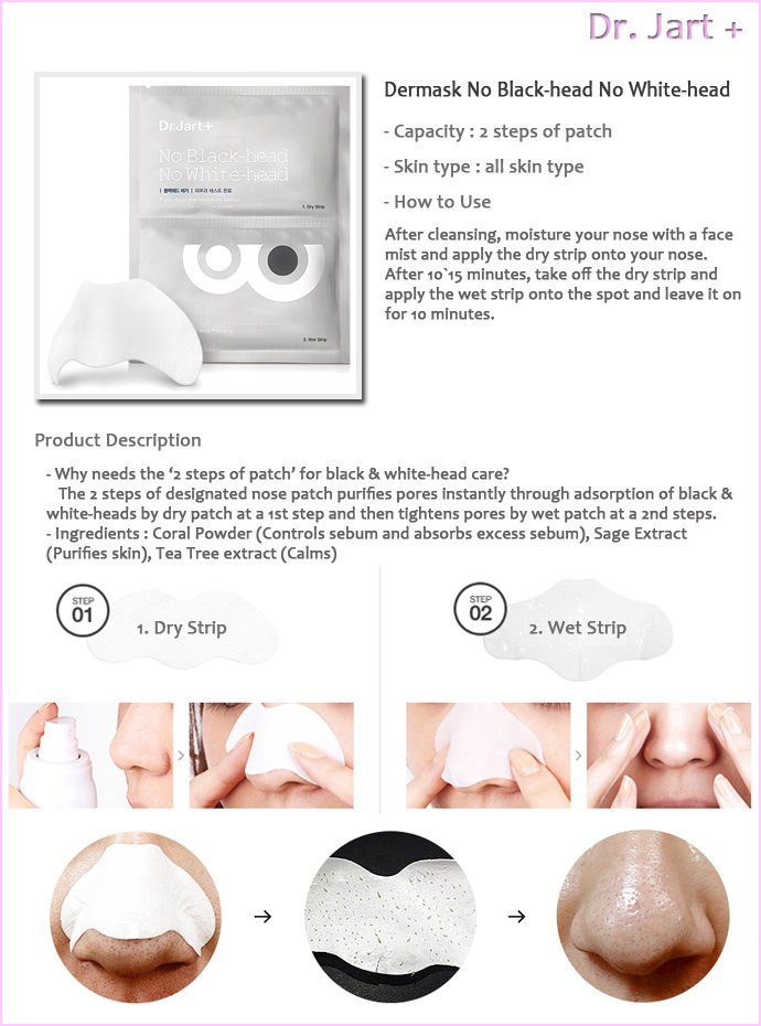 Dr.Jart+ Dermask No black-head, No white-head adalah produk yang benar-benar membersihkan komedo dan whiteheads dengan bentuk strip yang dirancang sempurna. Mengandung tea tree oil, sage, dan ekstrak koral untuk menutrisi kulit yang rentan berjerawat.