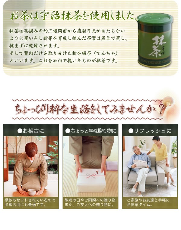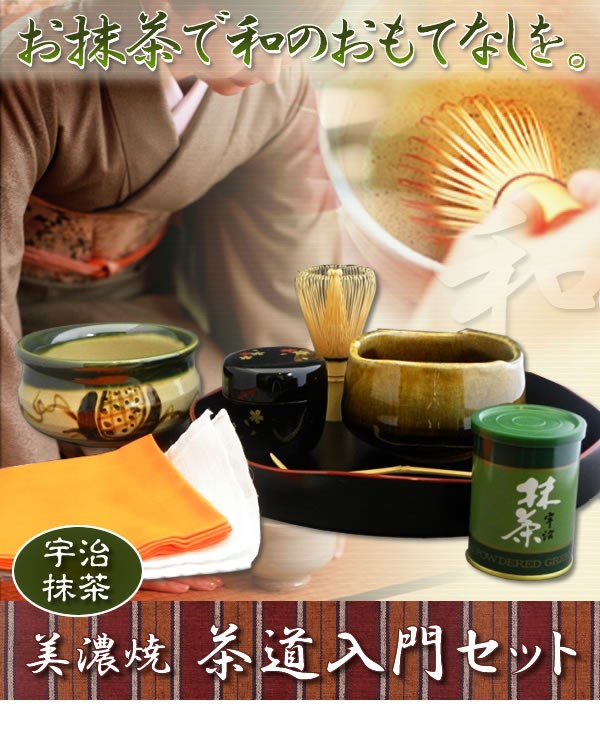 | 山道盆、抹茶碗、棗、建水、茶巾、茶筅、茶杓、袱紗、抹茶がセットになった茶道入門セット。お抹茶が付いていますので、届いたその日からご家族やお友達と手軽に楽しんでいただけます。 |