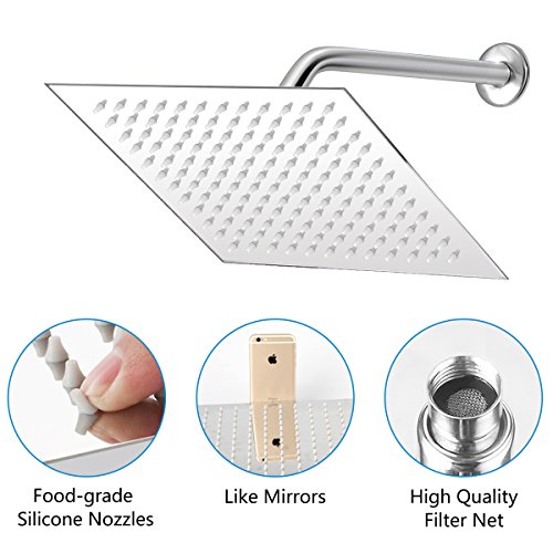- ☂LUXURY SHOWER DESIGN: Extra large rainfall shower head, 12 by 12 inch, ultra-thin only 2 mm thick, 144 high pressure silicone nozzles and gloss finish. With the swivel ball connector you can adjust and fix it to any angle you like. It immediately adds luxury look to your shower as if you are in a luxury hotel or spa.