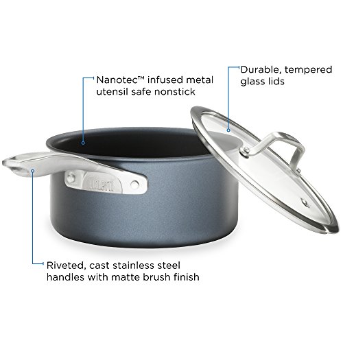 The elegant Sapphire Blue interior allows for superior release and lasting durability for a lifetime of cooking. The nonstick coating is PFOA free, metal utensil and dishwasher safe. The heavy gauge hard anodized aluminum vessel is twice as hard as stainless steel with an elegant Sapphire Blue easy clean exterior, and provides superior heat distribution and retention.