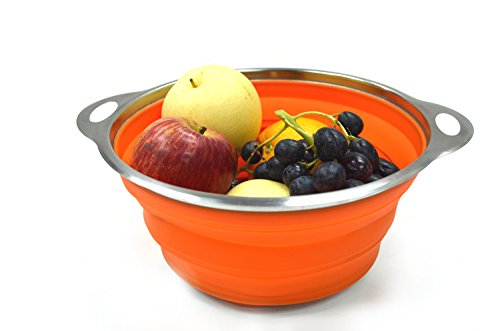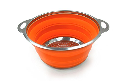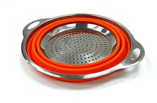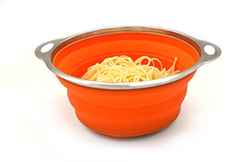 SAMMART Collapsible Silicone Colander with S/S Frame & Base - Space Saving Pasta / Spaghetti Strainer - Foldable Food Steamer - Portable Cooking Basket - Foldable Sieve / Orange & 24cm dia.