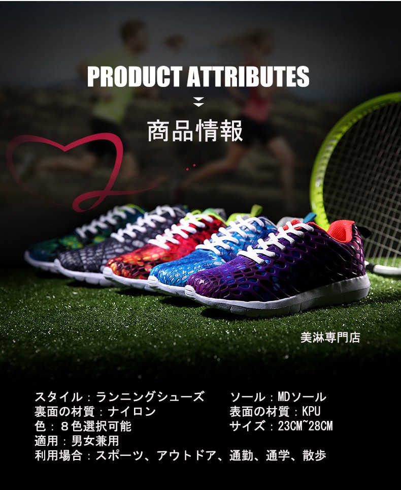 メイン素材: ポリエステル【高品質な材質】 表面素材:ポリエステル ソール:PUエアクッション 【軽量、通気性よい】軽量のソールとポリエステルの材質でスポーツシューズならではの軽さを実現し、通気性もよいです。どんな季節でも着用します。 軽量なので、ランニングや歩くや他の運動が易くになりました。 【男女兼用】カラフルな配色で、シューズがファッションになり、男性も女性も適用します。明るい色ので、着用した後、若くなりました。中学生などに通学靴としてもよい選択です。 恋人にも最適です! 【ソールが曲がる、耐滑】柔らかい材質で作って、ソールが曲がれるので、スムーズな足運びをサポートします。球技や他の運動にもスムーズになりました。 【利用場合】スポーツだけでなく、通勤や通学やアウトドア、普段履きとしても カジュアルなコーディネートをお楽しみい ただけます。