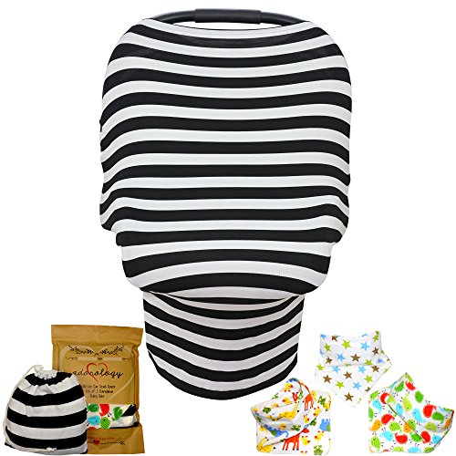 Baby Car Seat & Nursing Cover BONUS Bandana Drool Bibs & Drawstring Carry Bag Shower Gift Breathable Stretchy Universal 4 in 1 Multi-Use Infant Carseat...