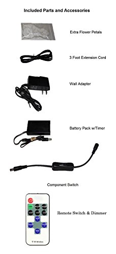 - This floral bouquet includes a 3V DC power supply with wall plug, component switch element, 3 foot extension cord, battery power pack with a 6 hour timer switch, and a remote dimmer switch.