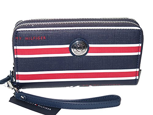 TOMMY HILFIGER RED BLUE STRIPED SAFFIANO LARGE DOUBLE ZIP WRISTLET PHONE WALLET