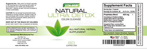 - Feature : **** Item expires in 3 years from the date of manufacturing mentioned at the base of the container**** NO BINDERS, NO FILLERS, AND NO ARTIFICIAL INGREDIENTS! Vita-Web's Colon Cleanse is a pure and natural way to purify and detoxify your body with better ingredients over the competition. You will not only be pleased with the results, but your body will feel NEW again. You body will overall be better, lighter, cleaner, and less heavy after you take our natural Colon Cleanse. / TRUST OUR AMAZING REVIEWS THAT CUSTOMERS HAVE LEFT! Vita-Web's Colon Cleanse is made of a proprietary blend to help you achieve real results! Customers have been impressed with such a high quality product and such a GREAT deal. What other Doctor recommended product is easier to take than our Colon Cleanse. SAVE BIG NOW WHILE IT IS ON SALE and consider stocking up for not only you, but for your family and friends! / FLUSH YOUR BODY OF TOXINS AND START FEELING BETTER TODAY! Vita-Web's Colon Cleanse helps restore the "good" bacteria in your colon, which promotes colon health, aids in digestion, flattens your stomach, and helps you lose weight. Customers of ours have lost numerous pounds from simply taking our Colon Cleanse. The reviews are real just like the results that you will get. Customers have told us how they are feeling overall better even at less than the recommended dosage. / Keep your bowels regulated WITHOUT cramping, bloating, or fatigue. Vita-Web's Colon Cleanse is one cleanse that you will really be able to tell a difference with! Our Colon Cleanse cleans out your system by elimating the waste that your body accumulates over time. It will be easy on your stomach and keep you regular all at a GREAT price! / ***HUGE SAVINGS! Save $5 off our Colon Cleanse! Use Coupon Code HDN4B9AS*** GET RESULTS FROM A PRODUCT THAT WORKS! Our All Natural Colon Cleanse, promotes healthy cleansing of the colon. No running to the bathroom, or having to plan when to use it. Our all natural formula is gentle and effective with no harsh side effects. Our Colon Cleanse doesn't cause cramps or is harsh on your body. It will be gentle on your stomach, but still strong enough to get the job done right!