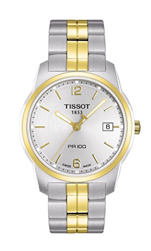 Stainless steel case with a two-tone (silver and gold-tone) stainless steel bracelet. Fixed gold-tone bezel. Silver dial with luminous gold-tone hands and index hour markers. Arabic numerals mark the 6 and 12 o'clock positions. Minute markers around the outer rim. Dial Type: Analog. Luminescent hands and markers. Date display at the 3 o'clock position. Quartz movement. Scratch resistant mineral crystal. Solid case back. Case diameter: 38 mm. Case thickness: 8.45 mm. Round case shape. Band width: 18 mm. Fold over clasp with safety release. Water resistant at 100 meters / 330 feet. Functions: date, hour, minute, second. Casual watch style. Watch label: Swiss Made. Tissot PR100 Silver Dial Two-tone Mens Watch T0494102203701.