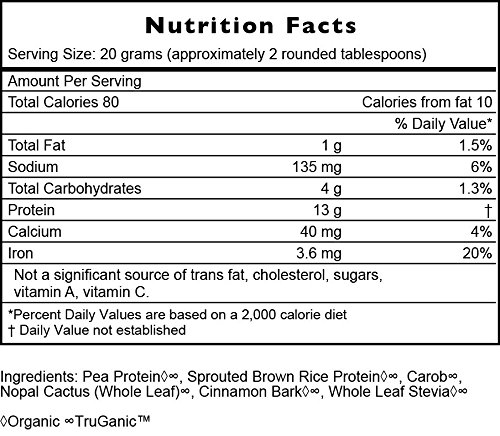 Warrior FoodTM Carob Ultimate is a 100% plant based, hypoallergenic, highly digestible, and complete protein powder made from organically-grown sprouted brown rice and yellow pea protein. Both the pea and brown rice protein in Warrior FoodTM are extracted and concentrated with purified water and enzymes at low temperatures. Absolutely no solvents of any kind are used in the extraction process. Includes whole leaf nopal cactus for blood sugar support. Warrior FoodTM is organic, vegan, kosher, and gluten-free. TruGanicTM Purity: Free of pesticides, GMOs, and irradiation; verified by actual testing. Lab tested for botanical identity, heavy metals, and microbiological activity. Available in powder. EcoFreshTM packaging delivers superior freshness. Manufactured in U.S. vegan facility free of gluten, peanuts, and tree nuts.
