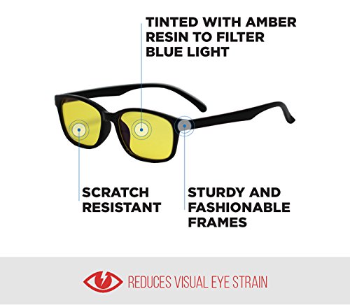 Studio : Blue Blockers Publisher : Blue Blockers Binding : Health and Beauty Product Description "Excellent! - Great Blue Blockers! - the best I've seen!" Want to know why so many Amazon Customers Everywhere LOVE the Blue Blockers Glasses? Here's Why! QUALITY AMBER TINT Because our product has Amber tinted lenses, you'll be able to use your computer, tablet, phone, or watch TV without visual discomfort. This is great because this means you will be able to comfortably relax for long periods of time while enjoying your electronic devices. REDUCE EYE STRAIN Our Blue Blocker Glasses will provide additional screen contrast with sharpened details which means that you will improve your focus and reduce eye strain. STYLISH Our blue blockers for men or women have comfortable and stylish black plastic frames which means that you can wear them anytime and anywhere. And what this really means is that you can beat the draining effects of your work computer and fluorescent lights in your office by wearing your fashionable Blue Blocking Glasses all day. Here's What an Amazon Customer recently said, "I frequently have to do computer work at night and the light keeps me awake even though I'm exhausted. These glasses are perfect as I can wear them over my reading glasses. I highly recommend them and wish I would have ordered them sooner." 0