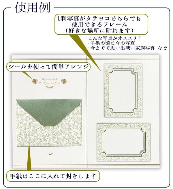 L判写真を収納できるフレームがついた結婚式用のレターセットです。フレームは好きな場所に貼れるので、タテヨコどちらでも使用可能。付属のシールを使えばアレンジも簡単!!レター裏面には本体表紙や封筒と同じ華やかな柄が入っています♪ |