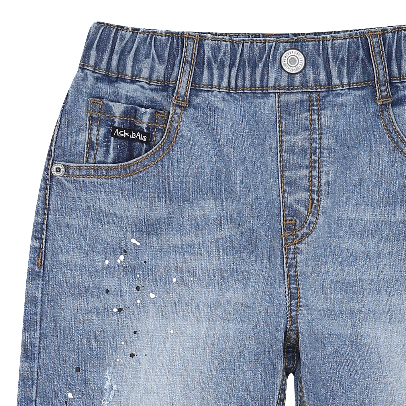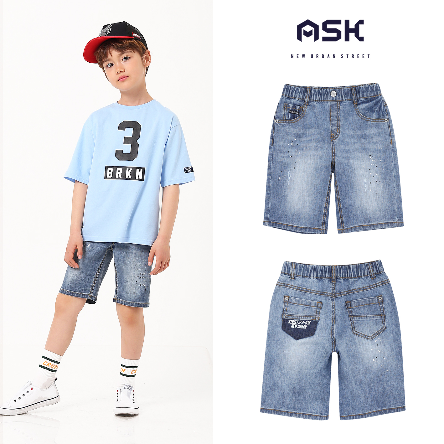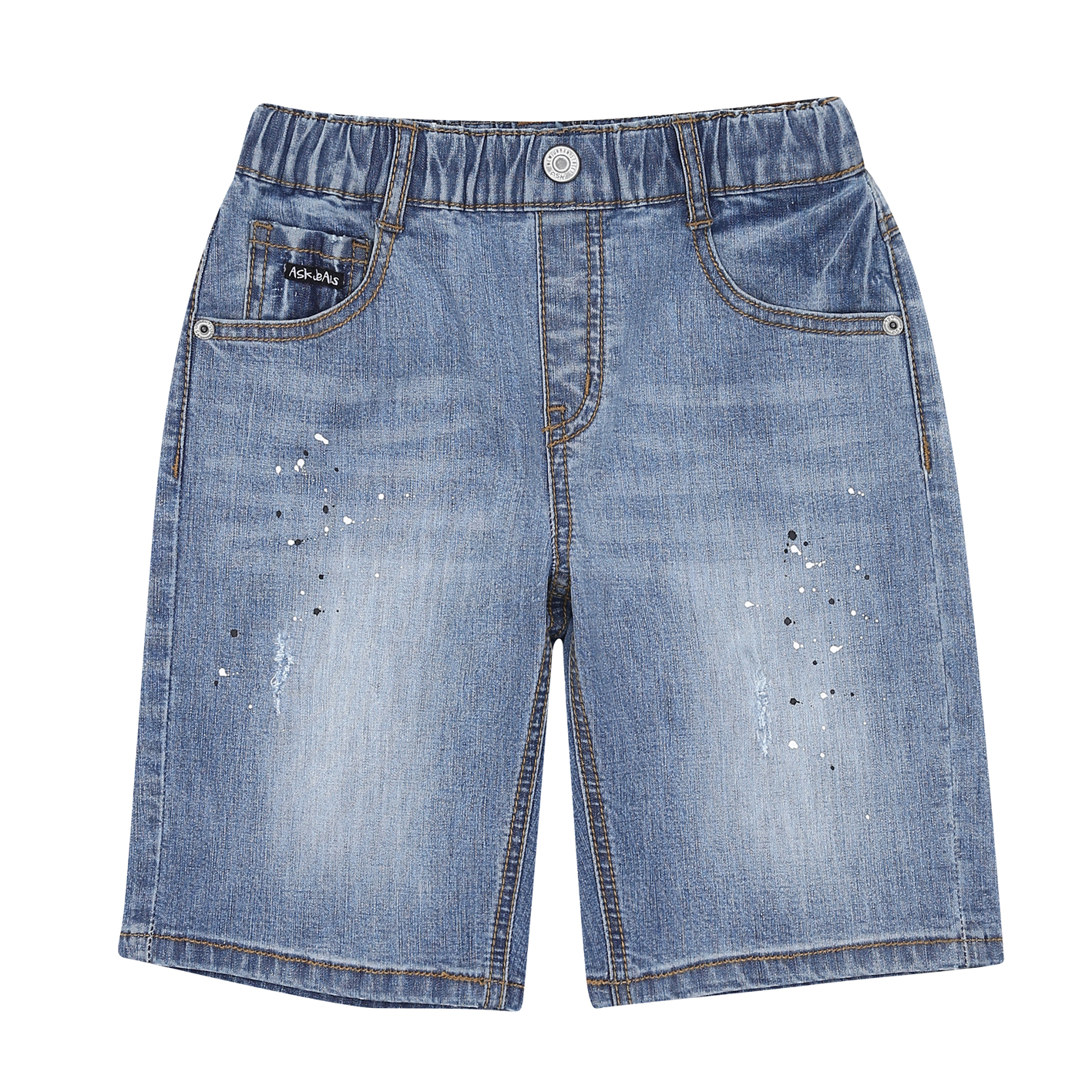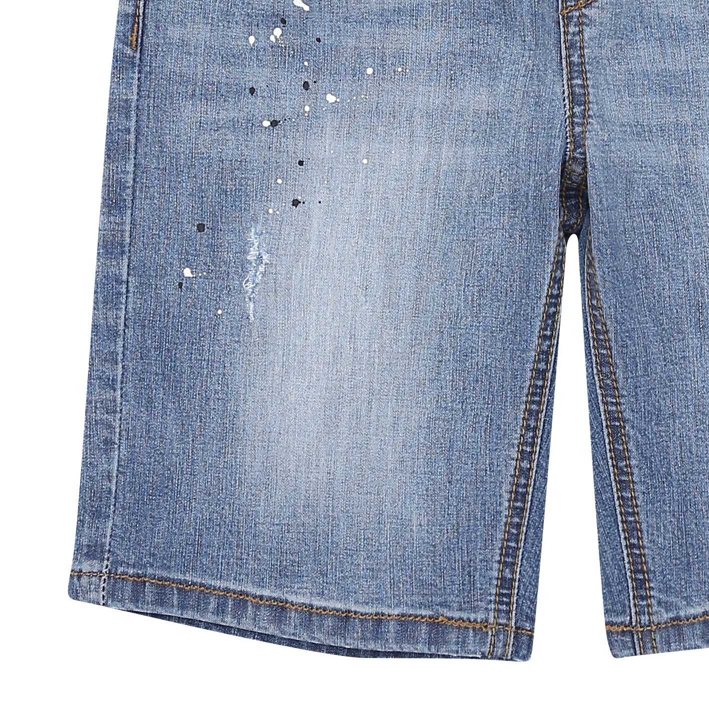 트렌디한 워싱감이 돋보이는 제깅스 5부 데님 팬츠. 밝은톤의 워싱감이 시원해 보이면서 데미지와 페인팅 포인트가 더해져 스타일리쉬해 보이는 아이템.