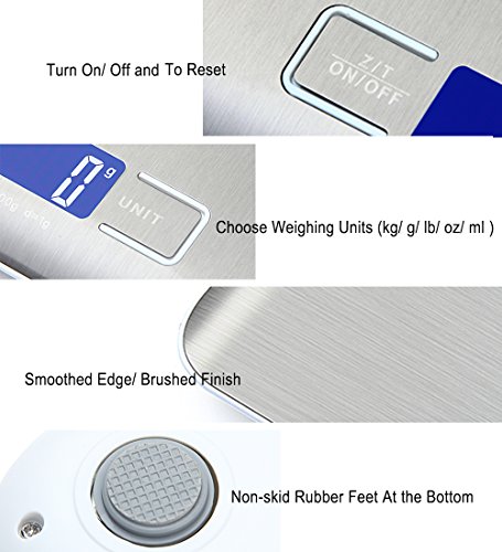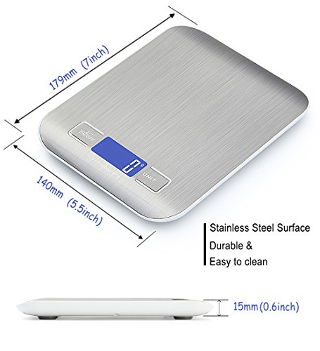 - COMPACT & SMART Kitchen Scale: --- The little stainless steel kitchen scale with the dimensions of 140mm x 179mm x 15mm / 5.5inch x 7inch x 0.6 inch (Length x Width x Thickness), light weight, save space and easy to store. Stainless steel platform is one whole piece which makes it more stable, convenient to clean. The edges of the scale is smoothed to avoid hurting your fingers. For accuracy, Please keep the scale on a level place when weighing.