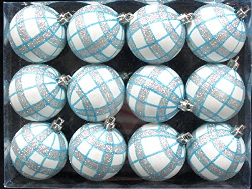 Queens of Christmas WL-ORN-12PK-PLD-AQ 12 Pack Ball Ornament with Aqua and Silver Plaid Design, White