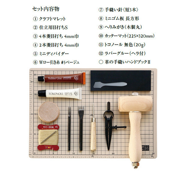 女性やレザークラフトビギナーの方にオススメ!!ウッドハンマーをはじめ、厳選した「手縫い基本工具12点」と手縫いの基本を網羅した「革の手縫いハンドブック」をセットにしました。
