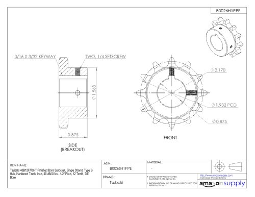 Tsubaki 40B12FP Finished Bore Sprocket, Single Strand, Hardened Teeth, Inch, #20 ANSI No., 1/2" Pitch, 12 Teeth, 7/8" Bore