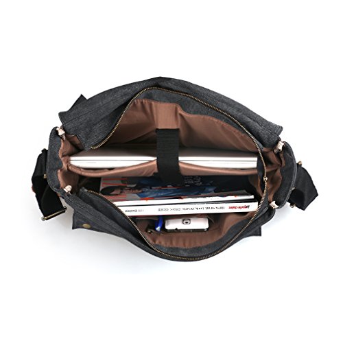 -. Feature : This messenger bag is constructed from durable heavy weight cotton canvas material, Crazy horse leather and bronze metal / Thicken wide adjustable High-density shoulder strap make the bag comfortable to carry / Overall Dimensions: (14"Medium 13.7 x 4.7 x 7 inches) (15.6"Large 14 x 4 x 10 inches); Multi pockets: one main pocket, two front pockets, a zippered back pocket; a inside zipper pocket; Unique design accommodates most 16 inch laptops / It's suitable for unisex and worn by both genders, perfect for business, school, and hiking / Secure design: Dual leather straps with adjustment buckles, antique finish brass metal buckles with zippers closure inside, security for valuables guaranteed