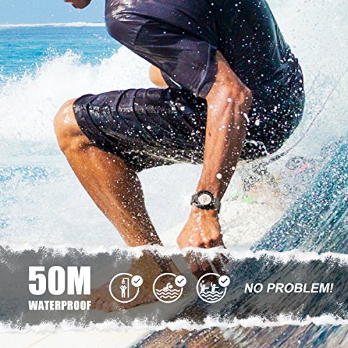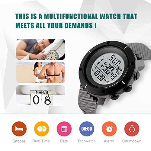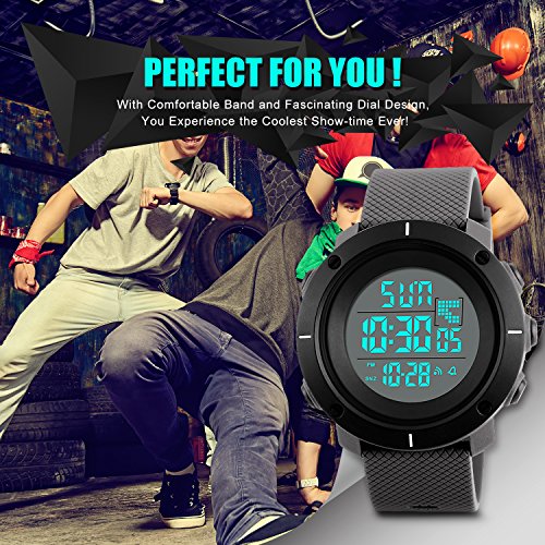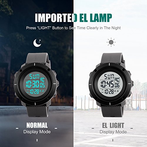 Highlights: • Imported Digital Electronic Movement provides precise and accurate time keeping • 12 / 24H Supported Electronic Dial. Dual Time Support Two Time Zone • Shower, Handwash, Swimming, No Problem! 50M 5ATM Water Resistant (Lifetime waterproof, not suitable for long time underwater activities such as diving. Please DONOT press any buttons underwater) • 2 EL Back Lights (Left Top and Right Second) , Electronic LED Dial • Comfortable Soft PU Band Strap, Stylish Minimalism Design. Durable Stainless Steel Case Back Cover and Buckle • Calendar: Date, Week, Month. Alarm and Hourly Chime. Countdown. Stopwatch Timer: 1/100 Second Chronograph with Split Functions • Shock Resistant, Suitable for both outdoor and indoor activities & sports, such as running, climbing, ect •**Please Take Off the Protection Film Cover On the Watch Face Before Use for Better Experiences** Material: • Case Front: Plastic • Case Back Cover: Stainless Steel • Band Material: PU (Polyurethane) • Watch Face: High Transparent Resin Glass Specification: • Band Color: Black • Band Width: 0.98 inch / 2.5 cm • Band Length: 9.84 inch / 25 cm • Case Thickness: 0.58 inch / 1.48 cm • Case Diameter: 1.97 inch / 5 cm • Max Perimeter: 9.65 inch / 24.5 cm • Min Perimeter: 5.71 inch / 14.5 cm • Product Weight: 2.01 oz / 57 g • Battery Code: CR2032 What Is In The Package: • Mens Digital Backlight Sports Watch x 1, User Manual x 1Feature