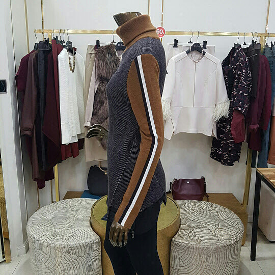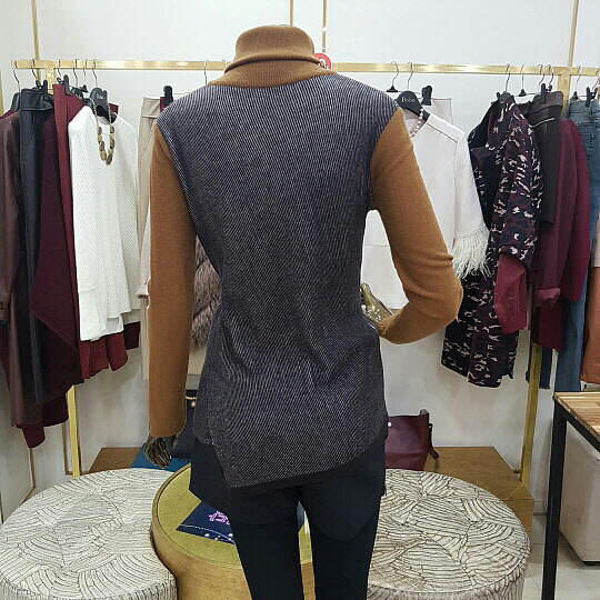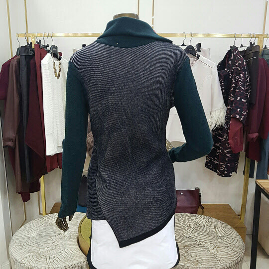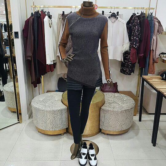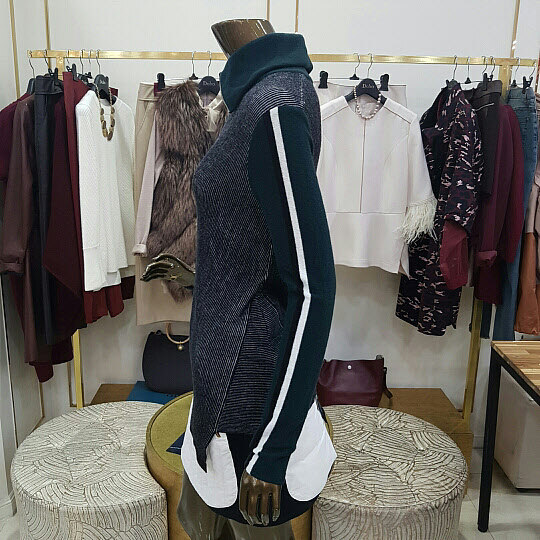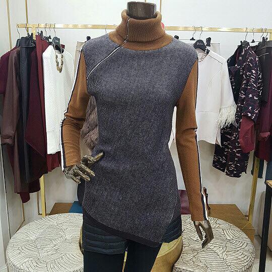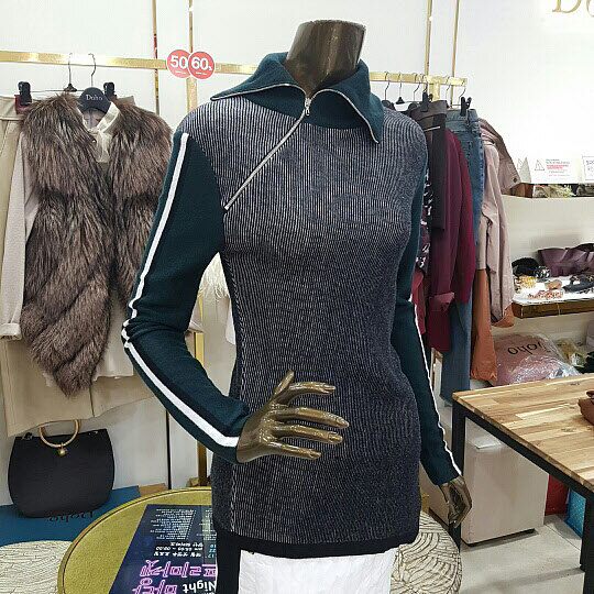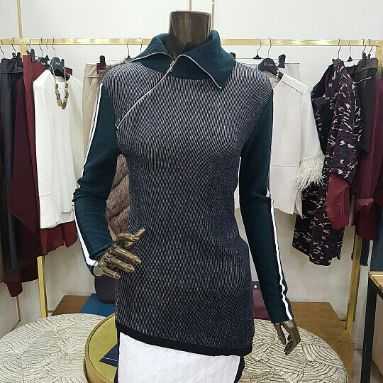 넥부분의 지퍼 장식이 특징인 니트 제품입니다니트제품 특성상 착용감이 좋으며 밑단 부분이 사선으로 처리된것이 특징인 아이템 입니다