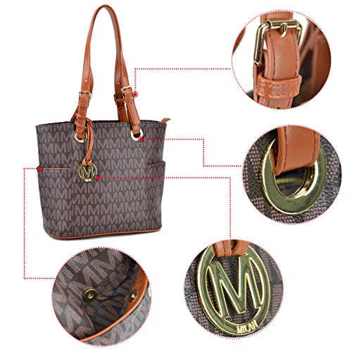 -. Title : MMK Collection Monogram Logo Vegan Leather Semi Dome Shape Women Multi-Functional Satchel and belted Tote with Open Side Pockets