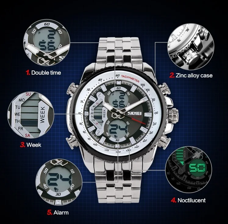 Feature:Back Light,Alarm,Water Resistant,Multiple Time Zone,Chronograph,Shock Resistant,Stop Watch,Complete Calendar,Auto Date,LED display