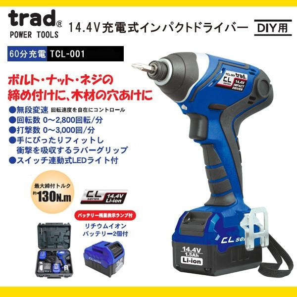 人気のDIY工具!バッテリーがシリーズ共通で使える!ボルト、ナット、ネジの締め付けに。木材の穴あけに。 製造国:中国 素材・材質:樹脂 商品サイズ:H230×W160×D75mm 重量:約1200g(バッテリー含む) 仕様:14.4V ※サプライヤー直送品 ご注文後3~4営業日後の出荷となります【商品名】TRAD 14.4V 充電式インパクトドライバー TCL-001