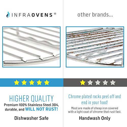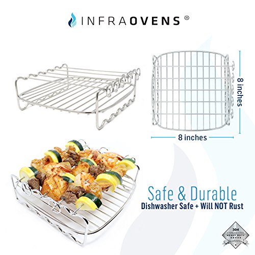 PROFESSIONAL GRADE 304 (18/8) STAINLESS STEEL DOUBLE LAYER RACK + 5 SKEWERS - Unlike other cheap racks made of iron covered with a coating of chrome, the Infraovens Double Later Rack and Skewers are Dishwasher-Safe and are made with premium 100% stainless steel, so forget about rusting or chrome flaking off into your food