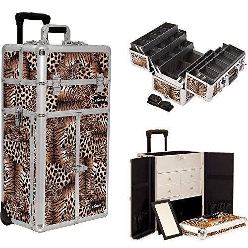 Sunrise I3465LPBR Leopard Professional Rolling Aluminum Cosmetic Makeup French Door Opening Craft Storage Organizer Case with Split Drawers and 6 Tiers Extendable Trays with Dividers