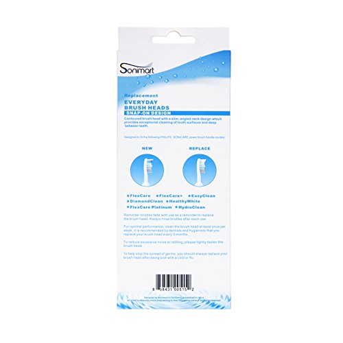 - Feature : Sonimart sensitive toothbrush heads with ultra soft britles are gentle on teeth and gums / Snap-on system fits: Sonicare 2 Series Plaque Control, Sonicare 3 Series Gum Health,DiamondClean, EasyClean, FlexCare, FlexCare+, FlexCare Platinum, HealthyWhite and HydroClean Philips Brush Handles / The quality of Sonimart Premium toothbrush heads is the MOST comparable to Philips Sonicare / OEHHA Prop 65 approved Sonimart toothbrush heads are made at the highest health and safety standard / Reminder bristles will fade when a replacement is needed, usually three months